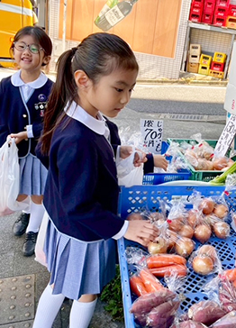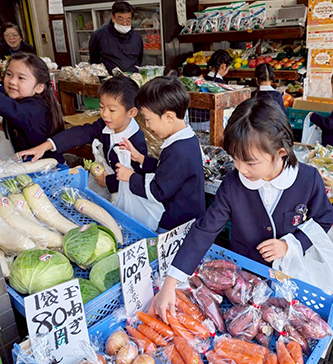 年長組はお店屋さんに向けて、八百屋さんで実際にお金を使って品物を買う経験をしました。