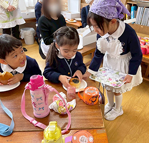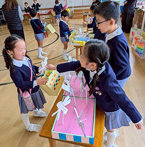 当日はお店屋さんの売り子になって色々な品物を売り、レストランでは美味しいパンとカフェラテのカップをサービスし、皆に喜ばれました。