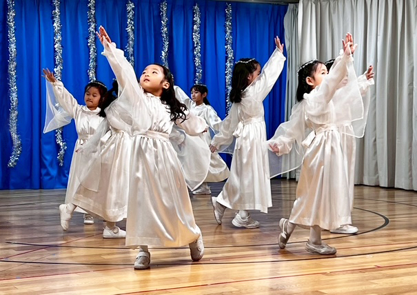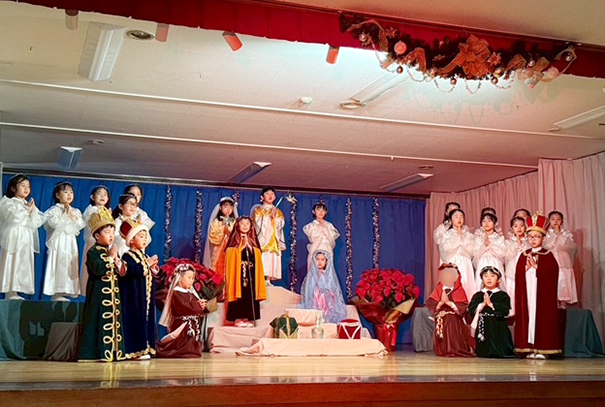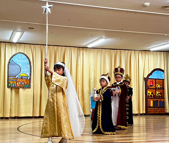 年長組はイエズス様がベトレヘムの馬小屋でお生まれになった日の出来事を劇にして、年中・年少組さんやご家族の方にご覧いただけるよう、頑張りました。