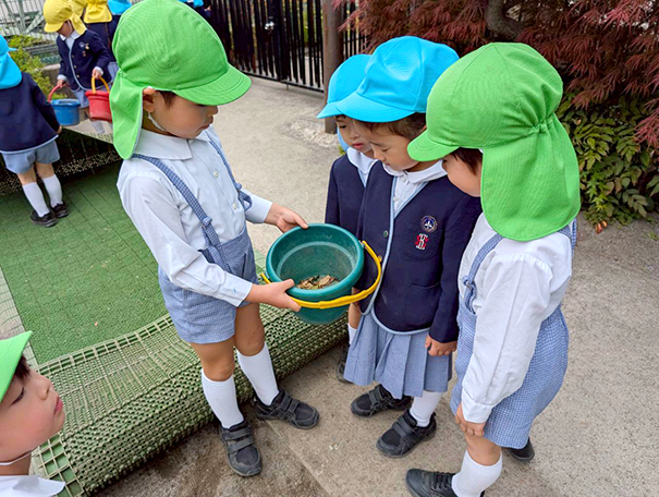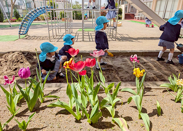 「園庭案内」の日には、年長組のお兄さま・お姉さまが、新しいお友達にお外遊びのお約束や遊び方を優しく教えていました。